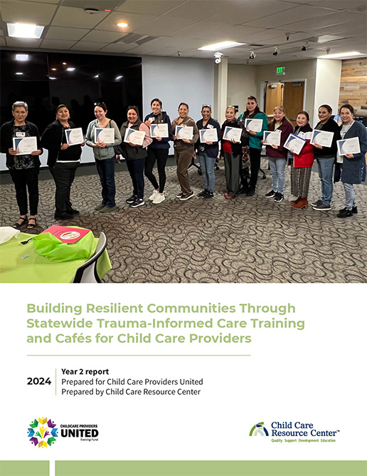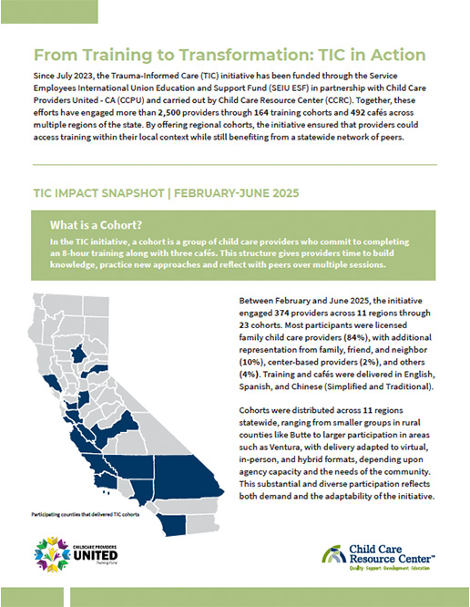 Since July 2023, the Trauma-Informed Care (TIC) initiative has been funded through the Service Employees International Union Education and Support Fund (SEIU ESF) in partnership with Child Care Providers United - CA (CCPU) and carried out by Child Care Resource Center (CCRC). Together, these efforts have engaged more than 2,500 providers through 164 training cohorts and 492 cafés across multiple regions of the state.